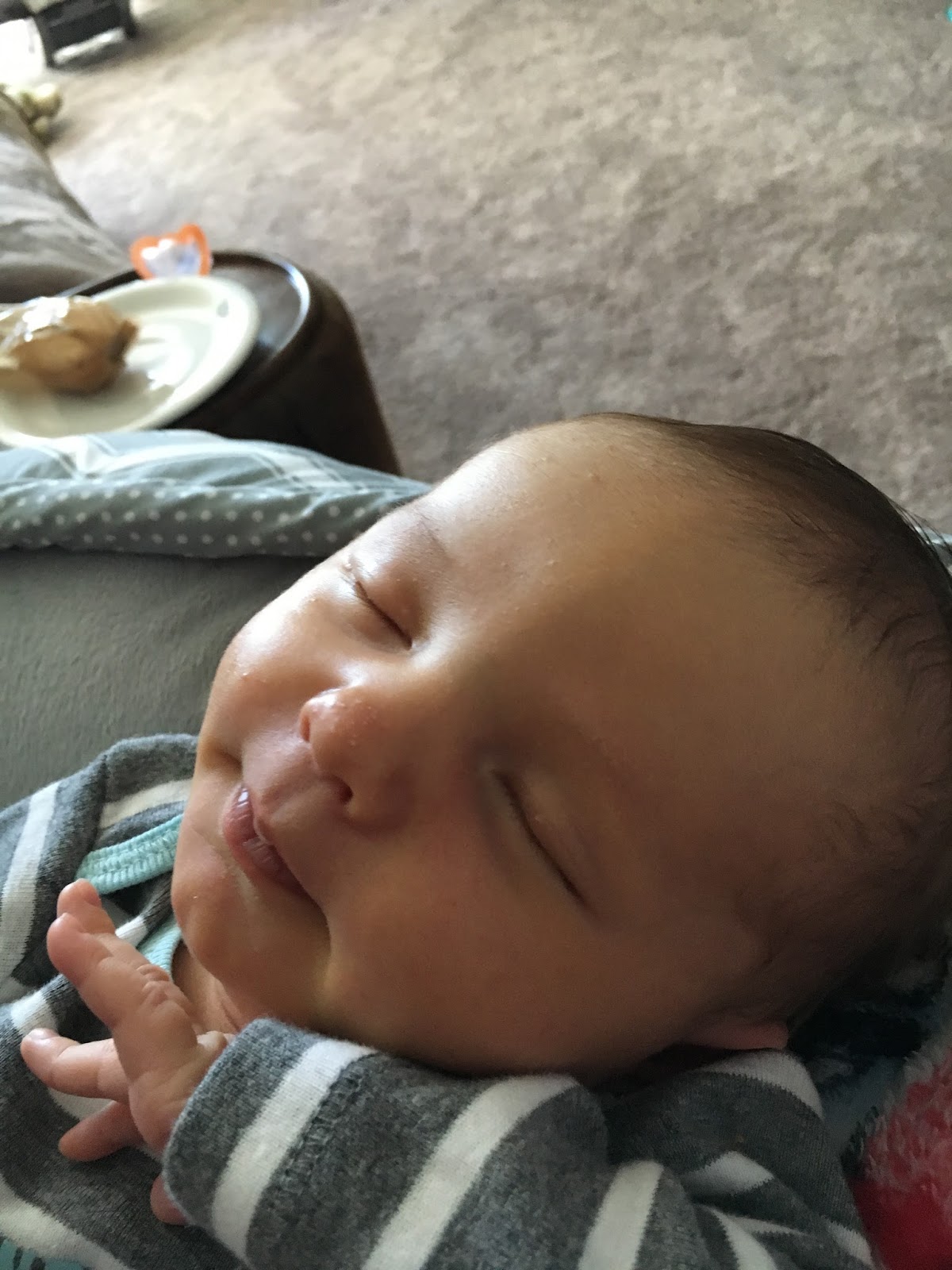 Isn't this the cutest little outfit on the cutest little baby? Keenan still loves to sleep and loves to scratch his face. We get excited when we see signs of a smile. It is probably just gas, but it is still adorable. He makes the funniest faces and we just sit and watch and fall more and more in love.